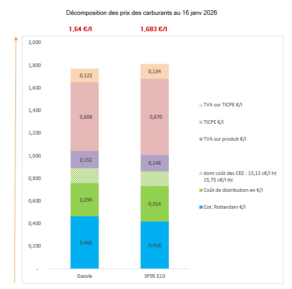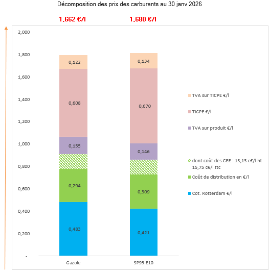 Carburants: Les prix des carburants affichaient une évolution modérée cette semaine, avec des hausses limitées sur l'essence et le diesel, tandis que le prix du pétrole Brent restait toujours en dessous de sa moyenne annuelle de 2025 fixée à 69,10$.B7 Le prix moyen du litre de gazole (diesel), carburant le plus consommé avec près de 80% des volumes, s'établissait à 1,6617 € TTC, en légère hausse de 0,32 centime par rapport à la semaine précédente (son prix Hors Taxe atteignait 0,7772 euro soit 0,26 centime de taxes supplémentaires sur la semaine).